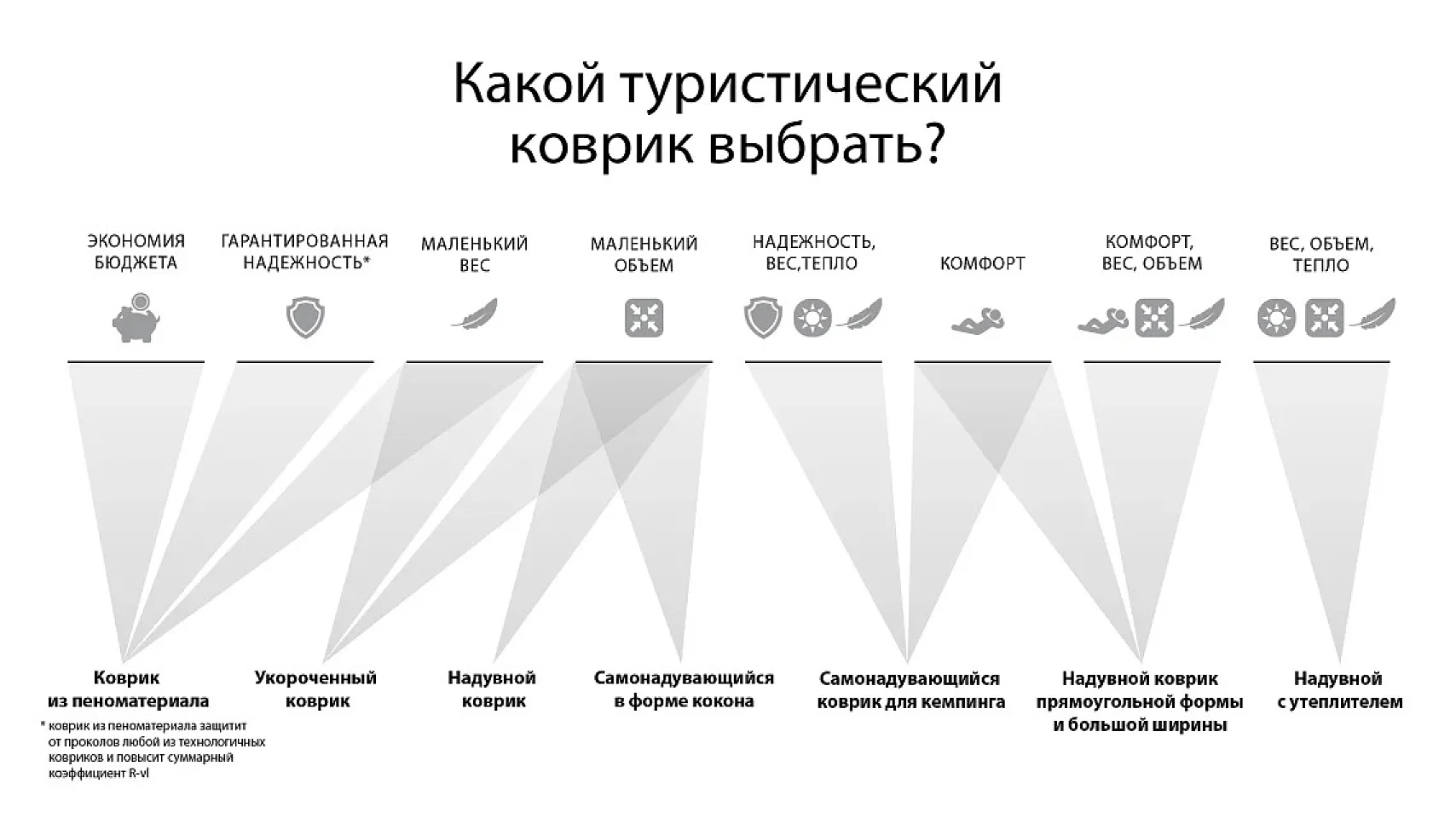 Правильнее делить туристические коврики по следующим критериям: