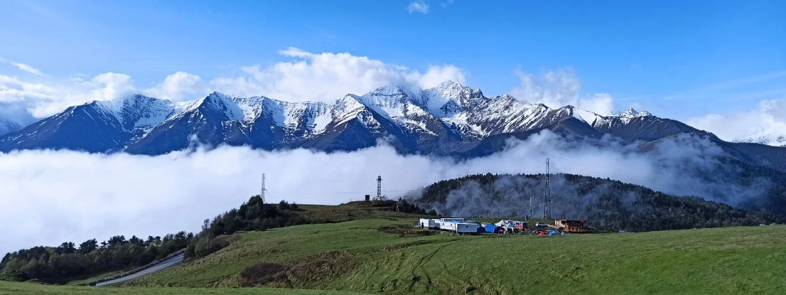 В лагерь ведёт прекрасная асфальтовая дорога. Не без крутых виражей горного серпантина и не без впечатляющих видов на заснеженные пики Главного Кавказского хребта (ГКХ). Хороша в любое время года и суток.