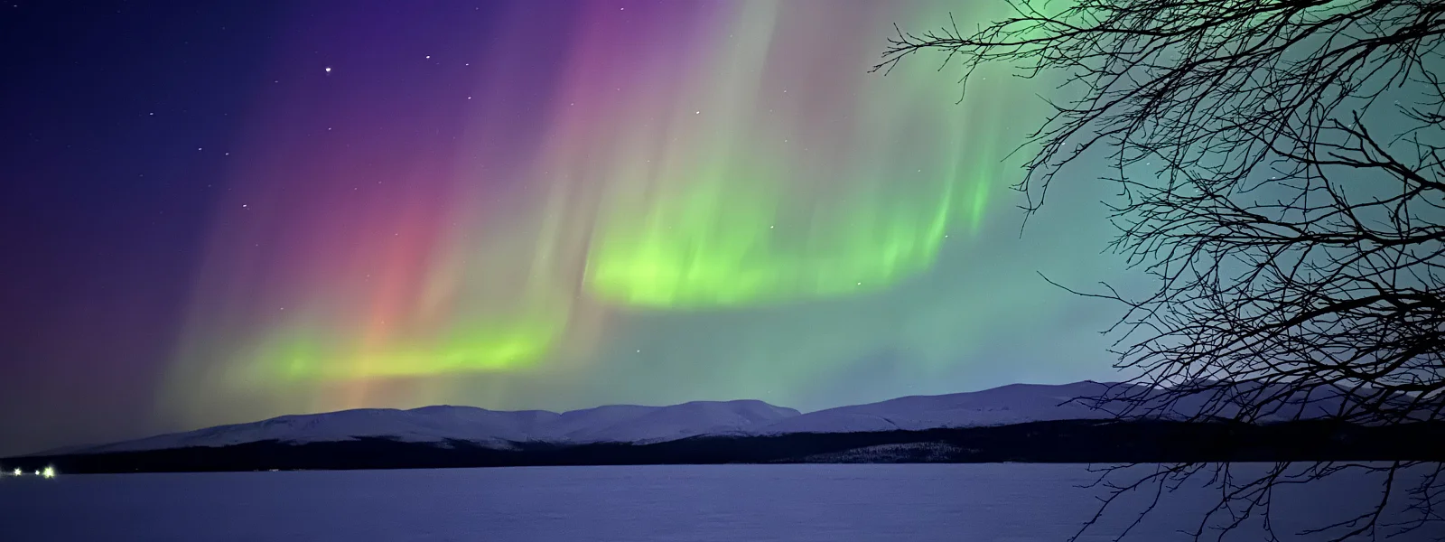 - Северное сияние: в ясные морозные ночи можно наблюдать танцы зелёных и пурпурных огней прямо над головой.