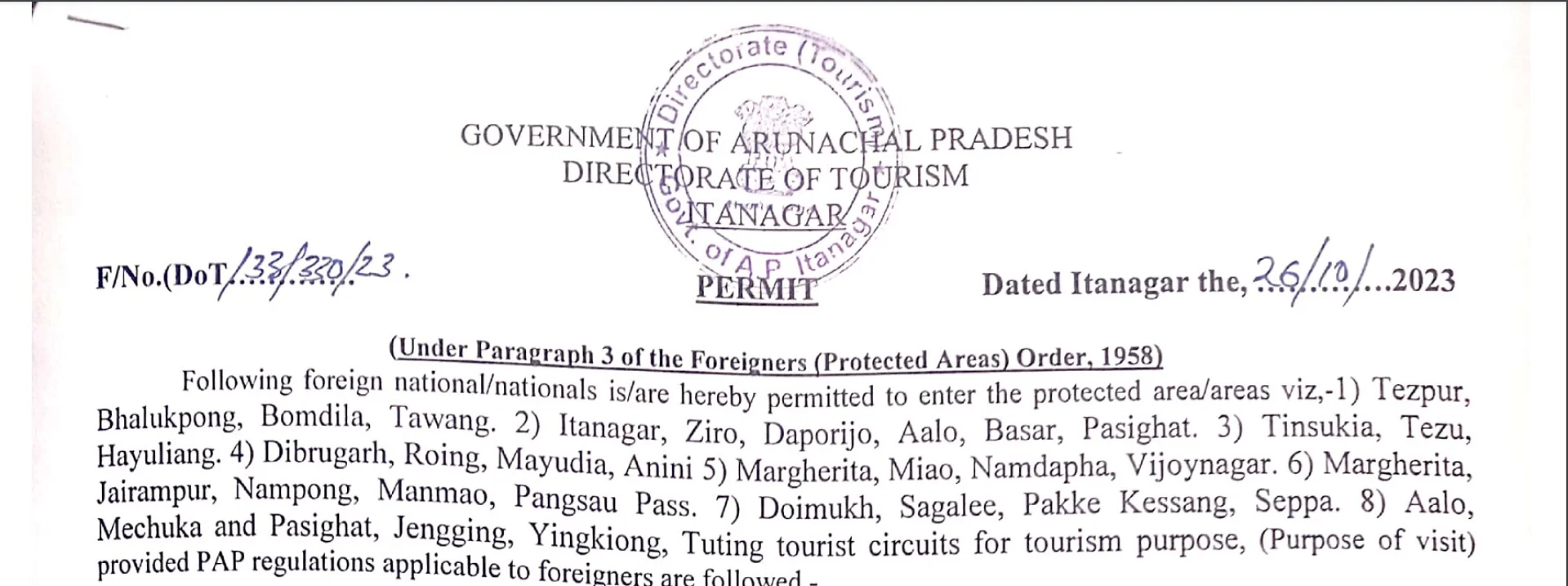 Аруначал-Прадеш является полузакрытой территорией. Все, включая индийцев из других штатов, должны получать специальное разрешение – пермит для посещения Аруначала. Самостоятельное оформление пермита для туристов невозможно, приходится пользоваться услугами местных немногочисленных турфирм. Разрешение стоит около 5000 рупий, срок оформления до двух месяцев. В заявке нужно перечислить регионы штата и населённые пункты, которые вы планируете посетить. От указанного плана отклоняться нельзя, поэтому обязательно внесите в заявку запасной вариант маршрута на случай, если что-то пойдёт не так.