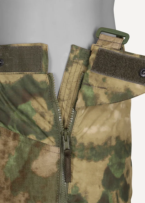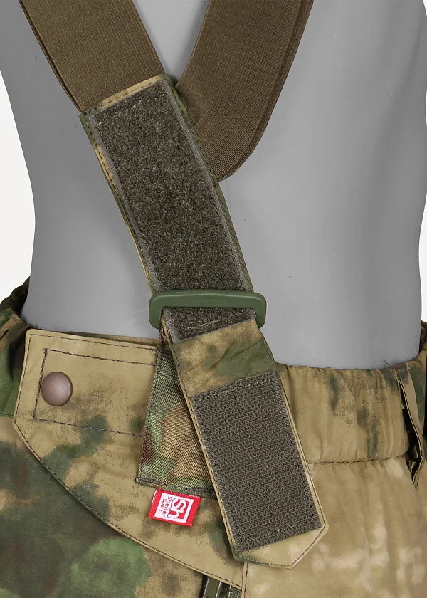 - Пояс подрезинен. Спереди застегивается на две кнопки. Имеются шлевки для брючного ремня шириной до 50 мм. По бокам широкие паты на липучках и кнопках, снимающие нагрузку с боковой молнии. К патам пришиты крепления подтяжек