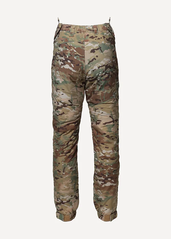 - Низ брюк стягивается вшитыми широкими резинками и дополнительно патами на липучках, снимающих нагрузку с боковой молнии. Имеется небольшая регулировка объема для использования с зимней обувью с толстыми голенищами. Усиления накладками из ткани Cordura® в наиболее протираемых местах — на внутренней стороне штанин, на изнанке низа в месте контакта с обувью, также из усиленной ткани выполнены нижние паты