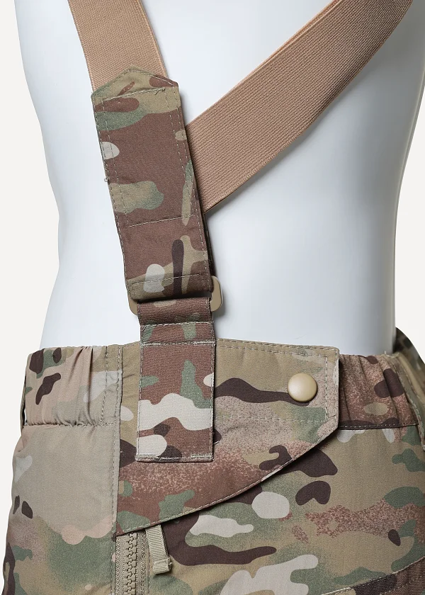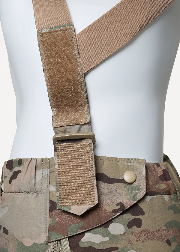 - Пояс подрезинен. Спереди застегивается на две кнопки. Имеются шлевки для брючного ремня шириной до 50 мм. По бокам широкие паты на липучках и кнопках, снимающие нагрузку с боковой молнии. К патам пришиты крепления подтяжек