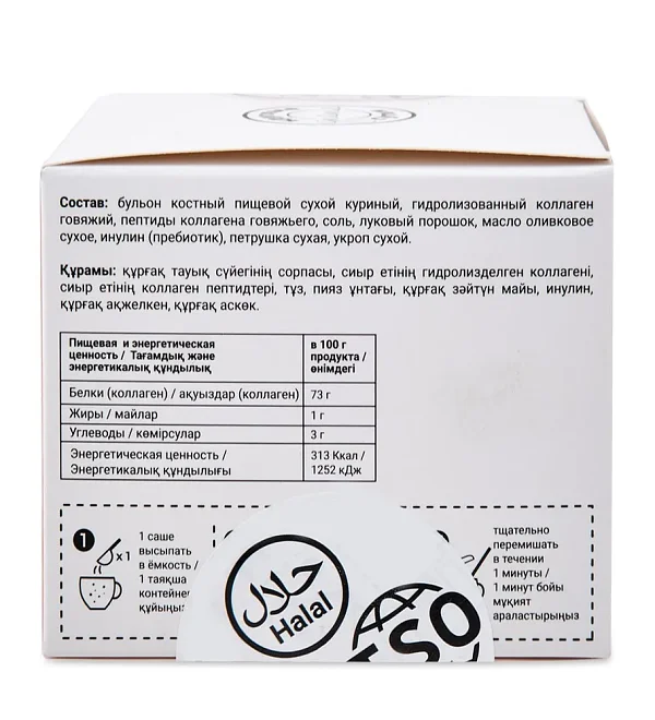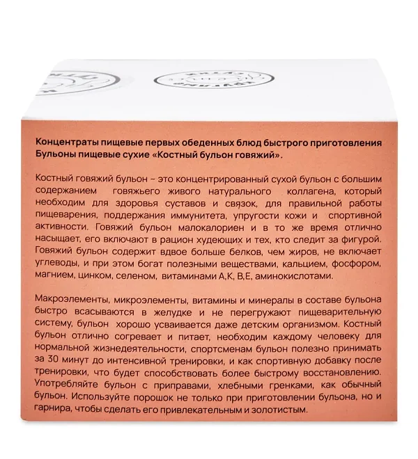 Костный бульон - это концентрированный сухой бульон с большим содержанием коллагена, включает ароматные приправы, среди которых сушёные овощи и зелень, а также оптимальное количество соли.
