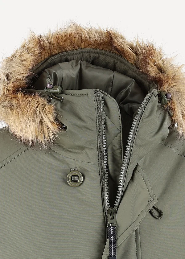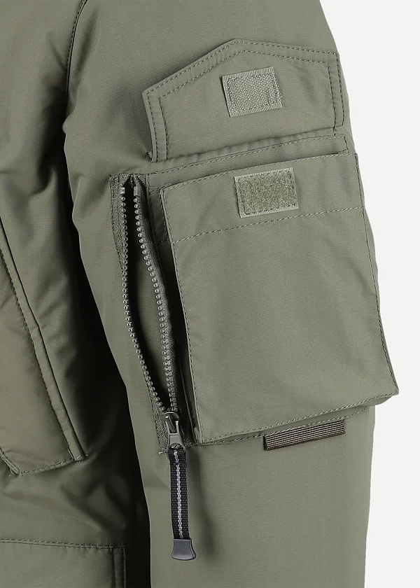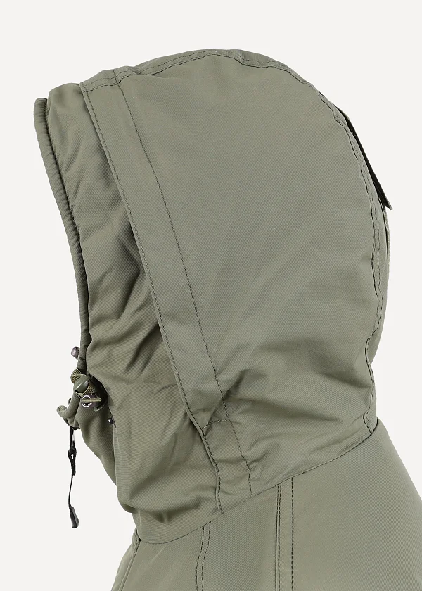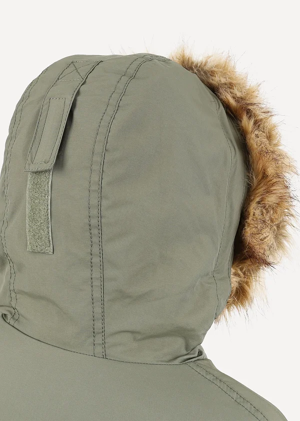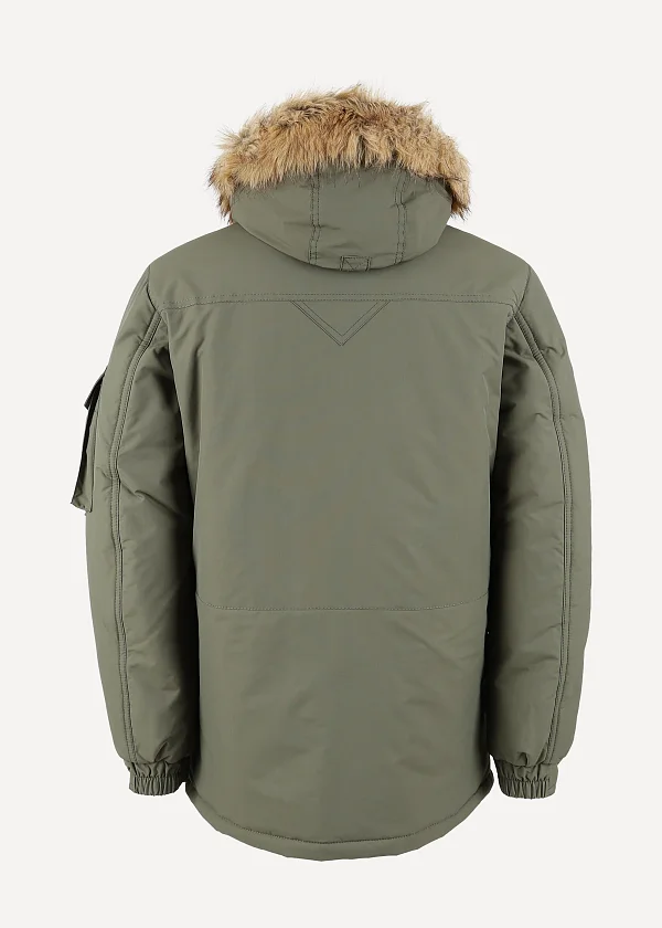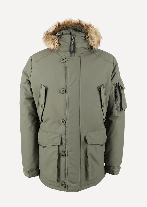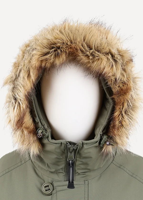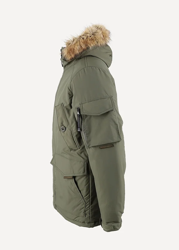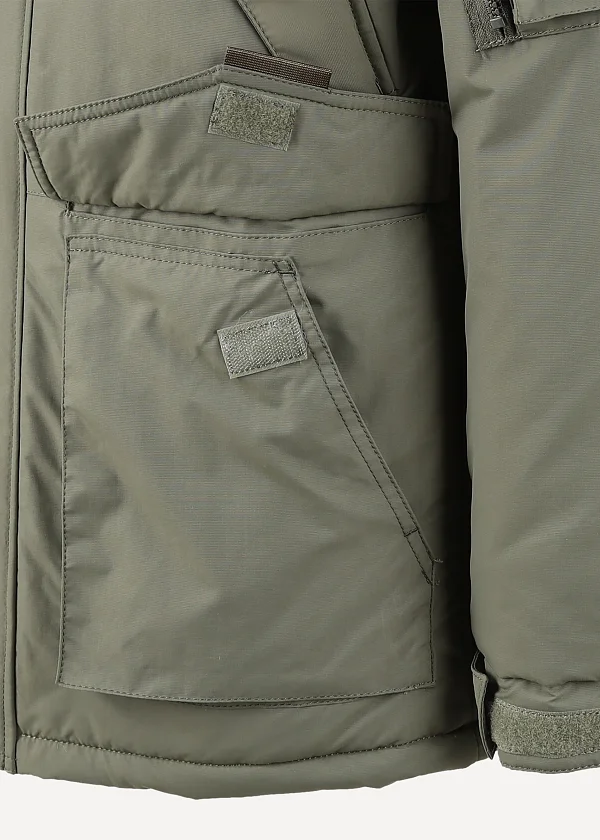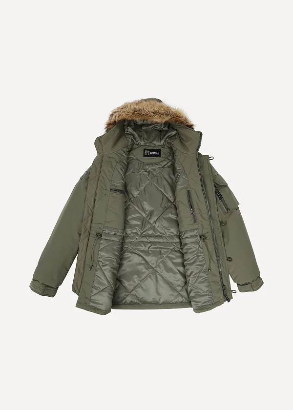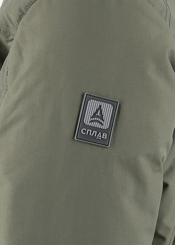 - Ветрозащитные внутренний и внешний клапаны, прикрывающие фронтальную «молнию»; опушка на капюшоне; высокий ворот и низ рукавов, регулируемый по размеру при помощи «липучки» с внутренним трикотажным манжетом, препятствуют проникновению холода под одежду