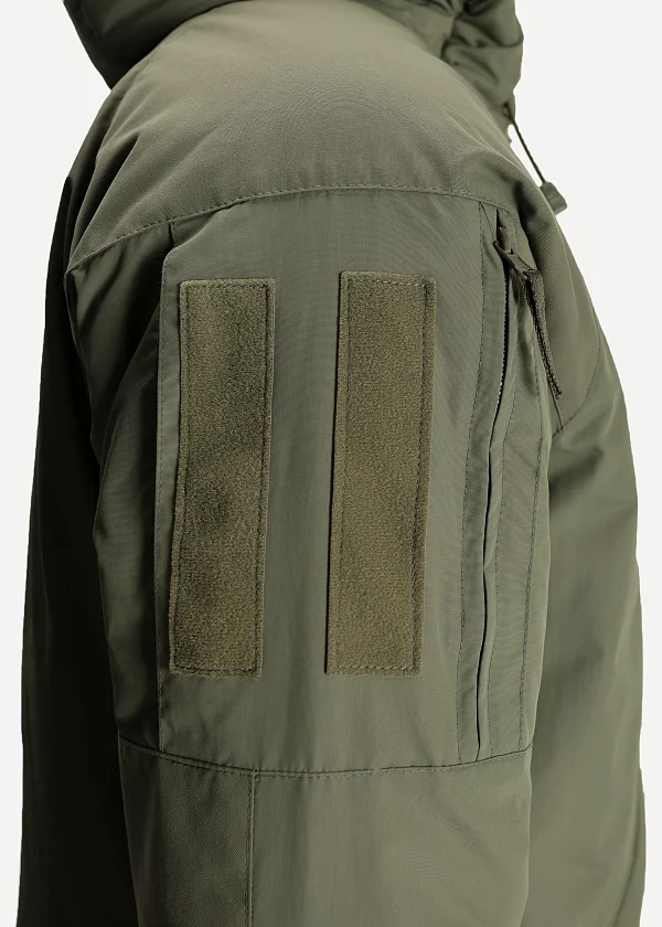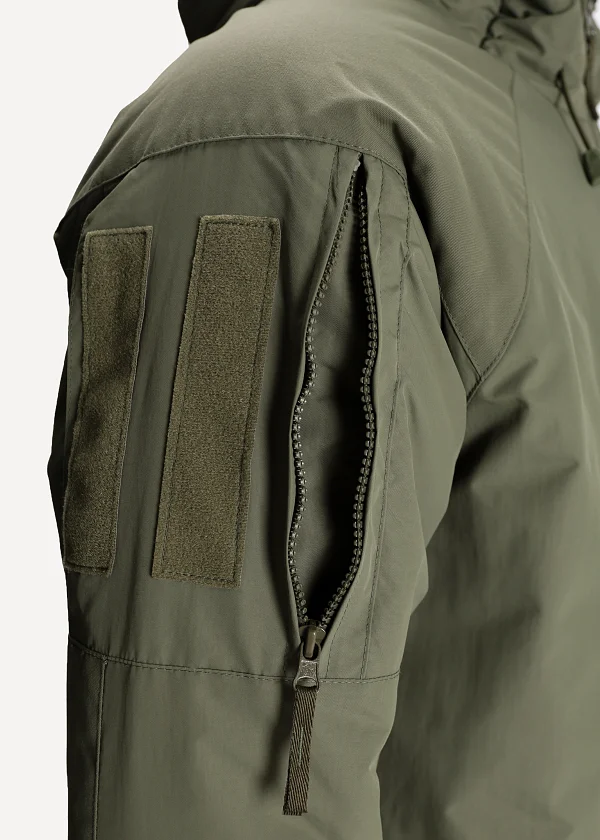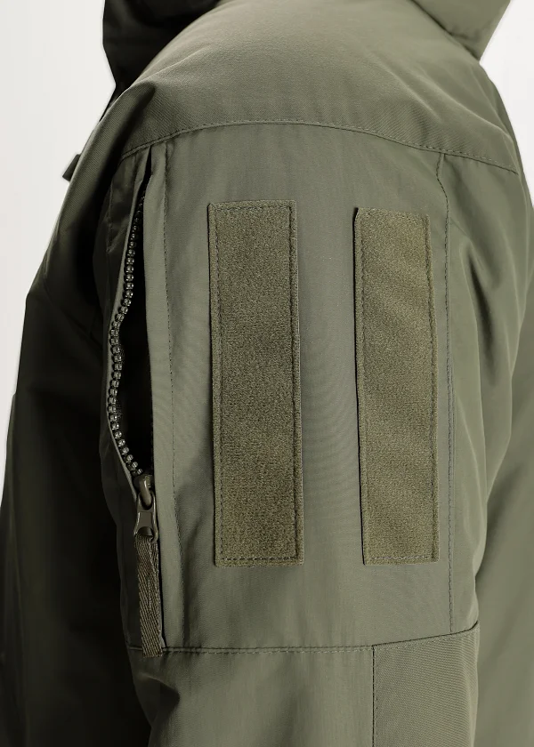 - Нарукавные карманы со входом на вертикальной тракторной молнии с ухватками из тесьмы, снаружи молния прикрыта узкими симметричными планками. Тонкий профиль. Сзади имеется складка для объема. Липучки для крепления шевронов (10×15 см) из двух фрагментов, выполнены методом лазерной резки со скруглением углов