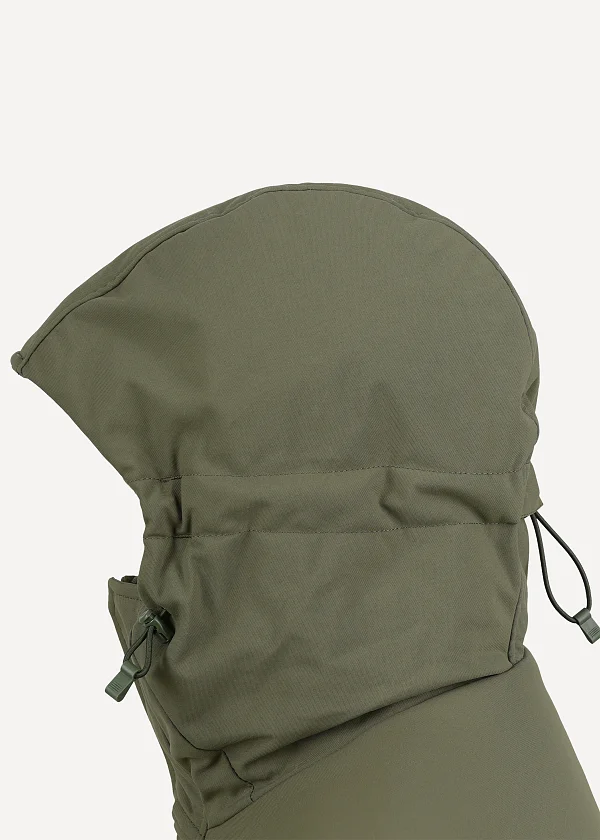 - Воротник и капюшон представляют собой единое целое. Козырек с пластиковым усом для поддержания формы. Капюшон регулируется в двух измерениях эластичным шнуром с фиксаторами Duraflex®: утяжка вокруг овала лица и утяжка объема (фиксатор на затылке). Внимание! Капюшон не рассчитан на использование со шлемом