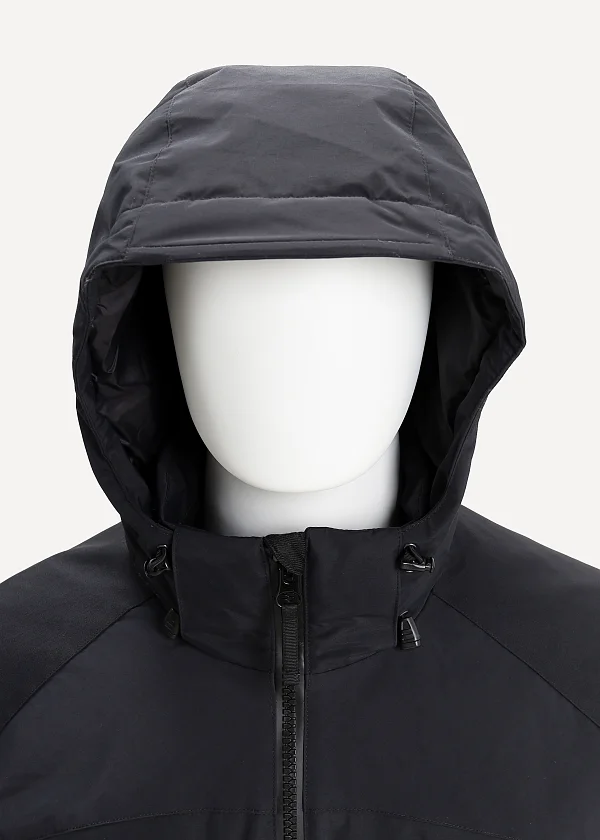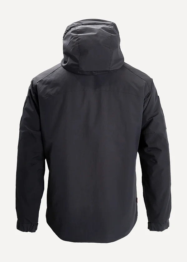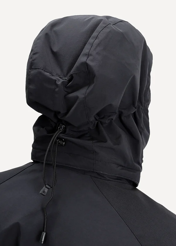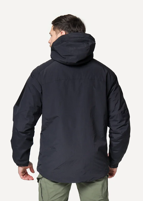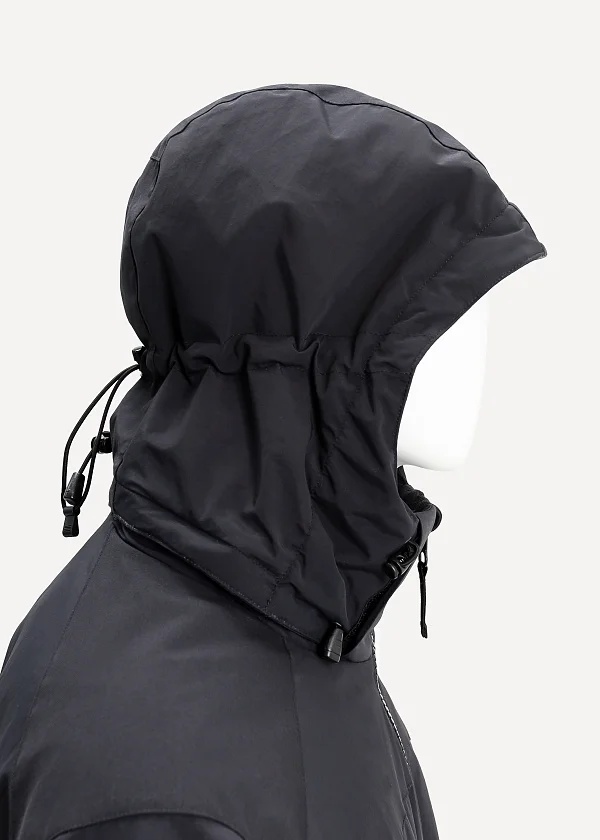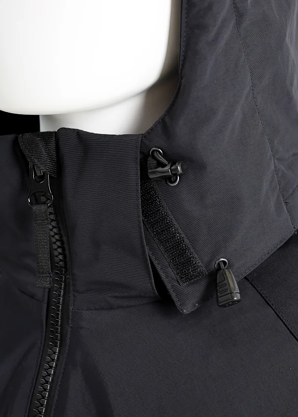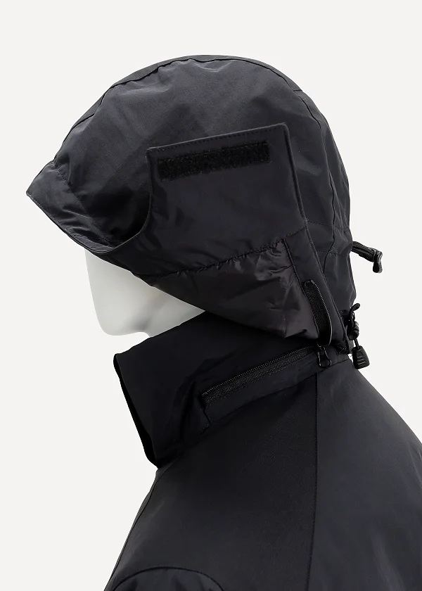 - Капюшон полностью съемный, пристегивается к основанию воротника с помощью скрытой под планкой молнии, а также крепится спереди с помощью липучек. Небольшой полужесткий козырек. Капюшон регулируется в трех измерениях эластичным шнуром с фиксаторами Duraflex®: утяжка вокруг лица (лишние концы шнура выведены наружу в основании капюшона), задние утяжки вокруг головы и по вертикали. Внимание! Капюшон не рассчитан на использование со шлемом