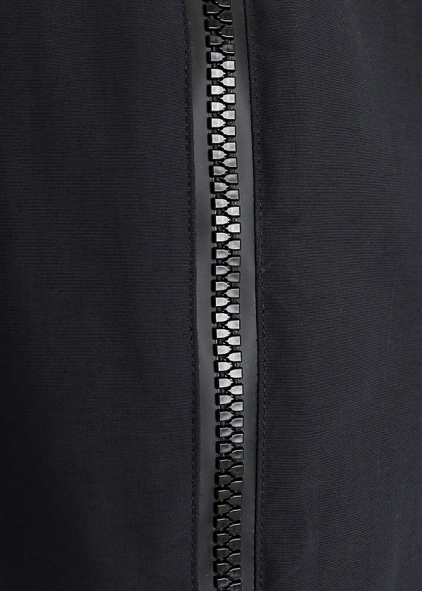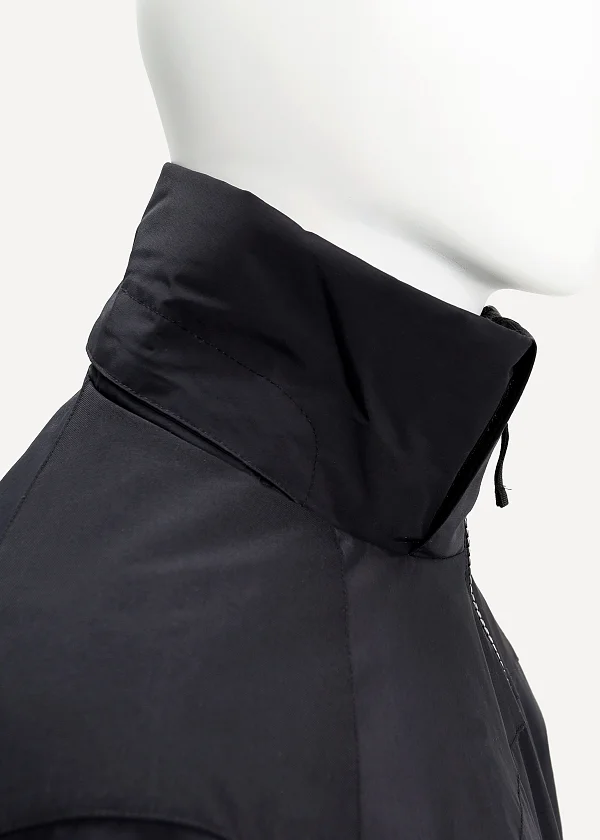- Центральная молния — брызгозащитная тракторная, двухзамковая, крупного типа. Изнутри во всю высоту молния прикрыта утепленной планкой для защиты от ветра. В области шеи планка отделана велюром для комфорта, и сверху загибается наружу для защиты подбородка. Внизу с изнанки имеется застежка на кнопке, снимающая нагрузку с молнии