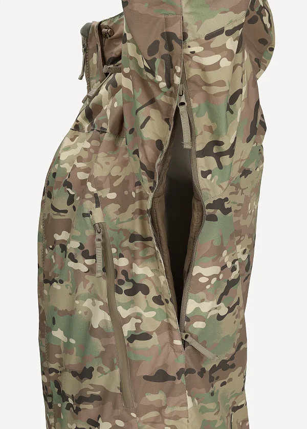 - Нагрудные карманы со входом на наклонной брызгозащитной витой молнии по бокам туловища. Карманы не перекрываются поясами РПС (warbelt) и рюкзаков, вход доступен при надетом бронежилете, разгрузочном жилете или нагруднике. Мешковина карманов выполнена из велюра