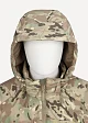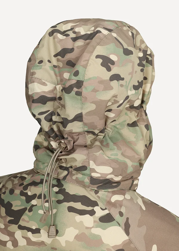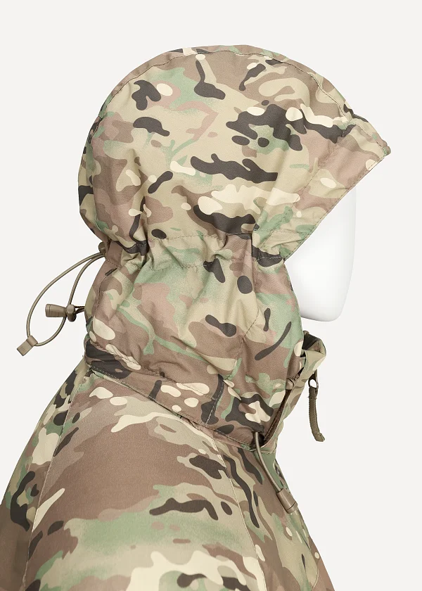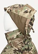 - Капюшон полностью съемный, пристегивается к основанию воротника с помощью скрытой под планкой молнии, а также крепится спереди с помощью липучек. Небольшой полужесткий козырек. Капюшон регулируется в трех измерениях эластичным шнуром с фиксаторами Duraflex®: утяжка вокруг лица (лишние концы шнура выведены наружу в основании капюшона), задние утяжки вокруг головы и по вертикали. Внимание! Капюшон не рассчитан на использование со шлемом