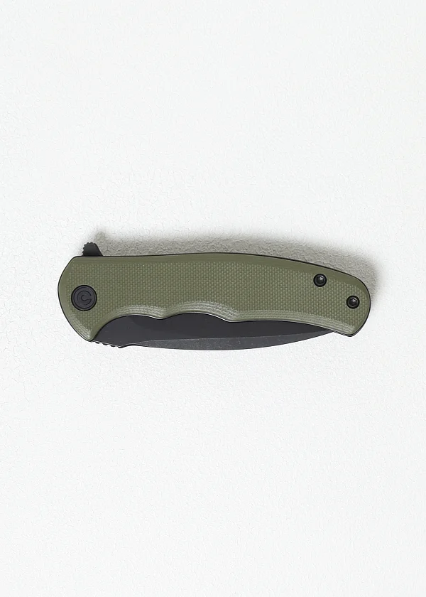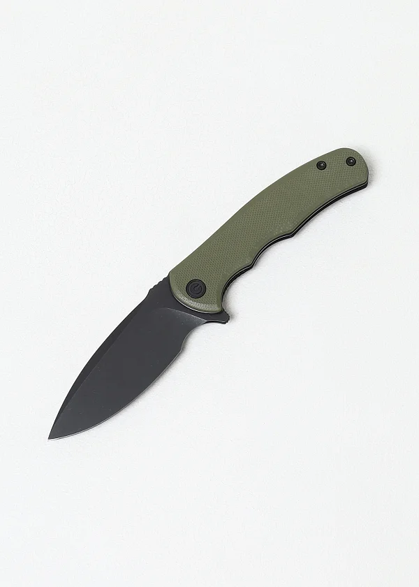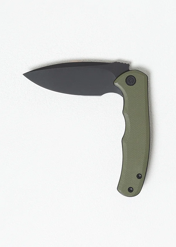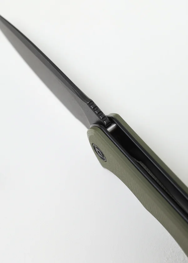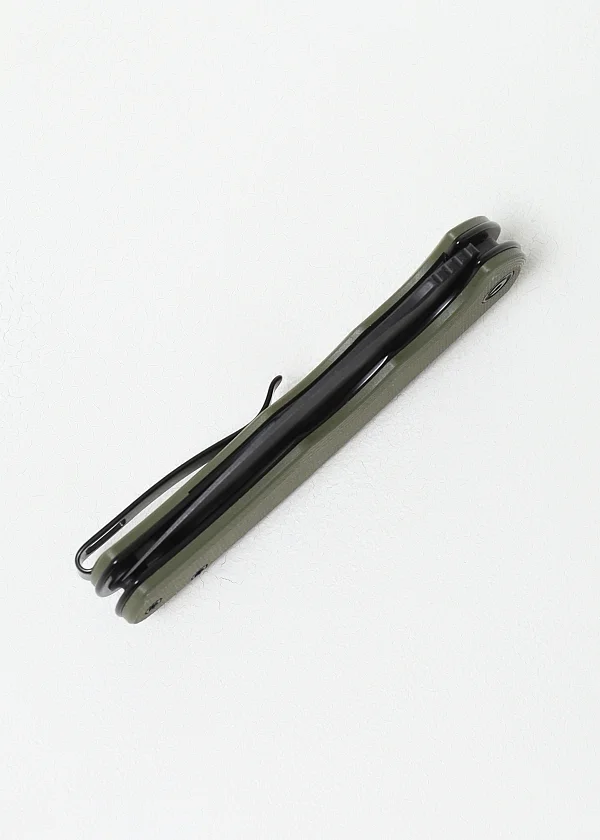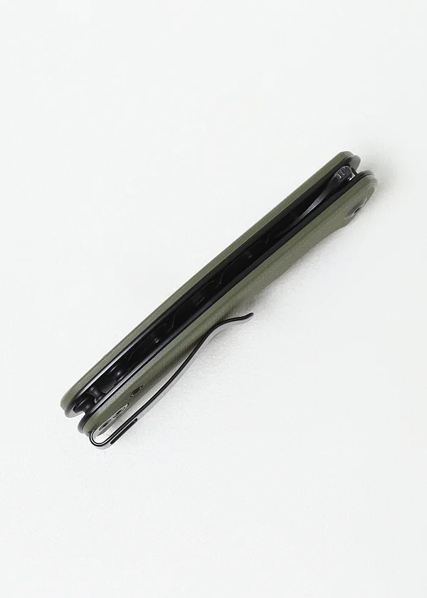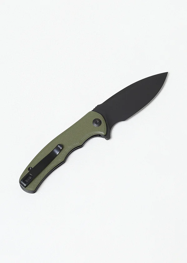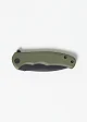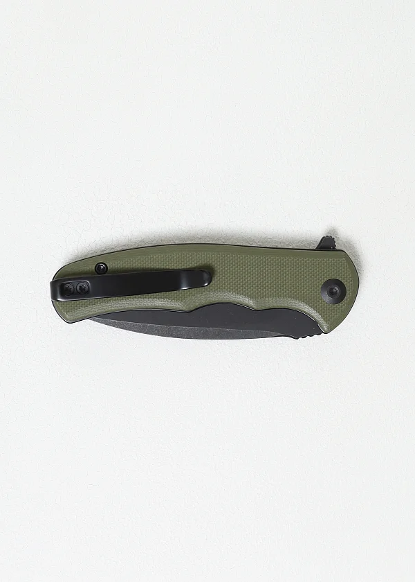 Рукоять зеленого цвета изготовлена из стеклотекстолита G10. Материал не подвержен износу и рукоятка ножа не выскользнет из ладони, даже если нож намокнет. Благодаря типу замка Liner Lock лезвие вылетает из рукоятки за долю секунды. Нож складывается также быстро одной рукой. В механизме отсутствует люфт, что держит клинок крепко и нож не “болтается” при применении. Также сбоку встроена клипса, с помощью которого нож цепляется за карман.