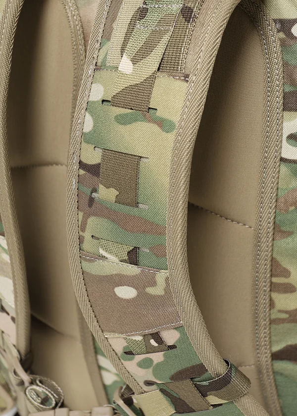 Несъёмные лямки с анатомическим силуэтом. Два слоя пены и подкладка из прочного эластичного нейлона для мягкости и комфорта. Верхние оттяжки. Ячейки PALS для крепления подсумков выполнены методом лазерной резки в ламинате из двух слоёв ткани Cordura® 500d, что обеспечивает лямкам тонкий профиль и плоскую поверхность, не мешая прикладке оружия. В комплекте съёмная грудная стяжка с подрезиненной для комфорта стропой.