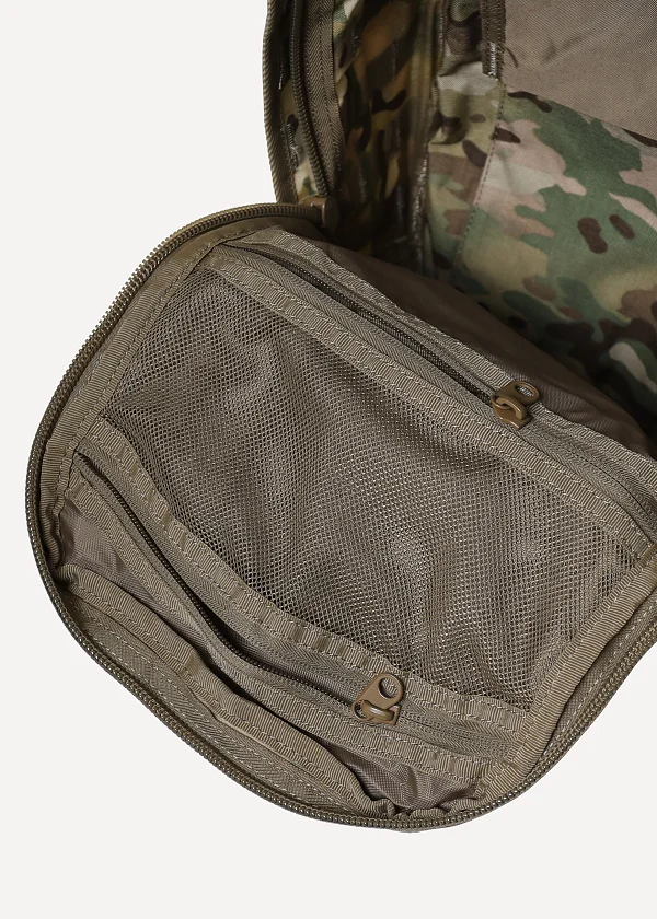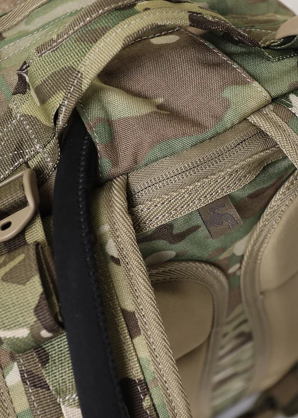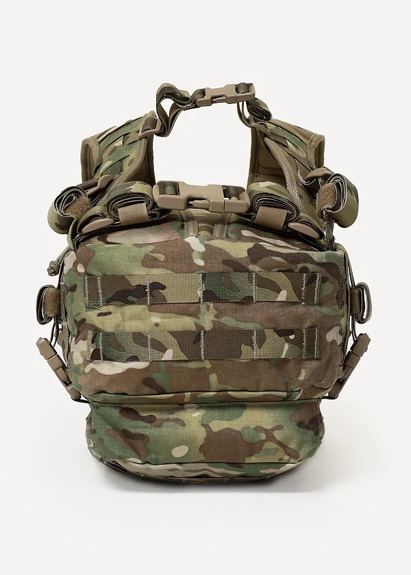 Несъёмные лямки с анатомическим силуэтом. Два слоя пены и подкладка из прочного эластичного нейлона для мягкости и комфорта. Верхние оттяжки. Ячейки PALS для крепления подсумков выполнены методом лазерной резки в ламинате из двух слоёв ткани Cordura® 500d, что обеспечивает лямкам тонкий профиль и плоскую поверхность, не мешая прикладке оружия. В комплекте съёмная грудная стяжка с подрезиненной для комфорта стропой