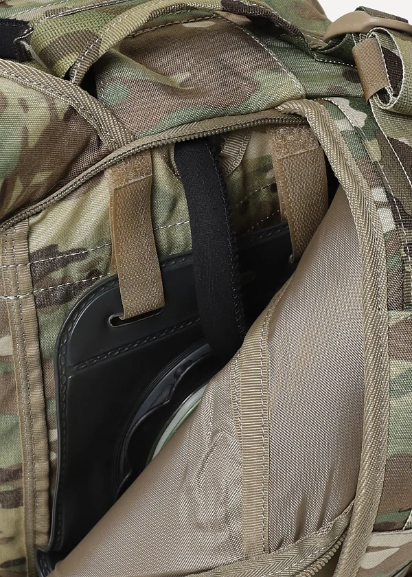 Вся свободная внешняя площадь ранца обшита стропами PALS. Используются нестандартные центрированные закрепки-зигзаги (начало и конец закрепки расположены в её середине для большей надёжности)
