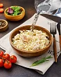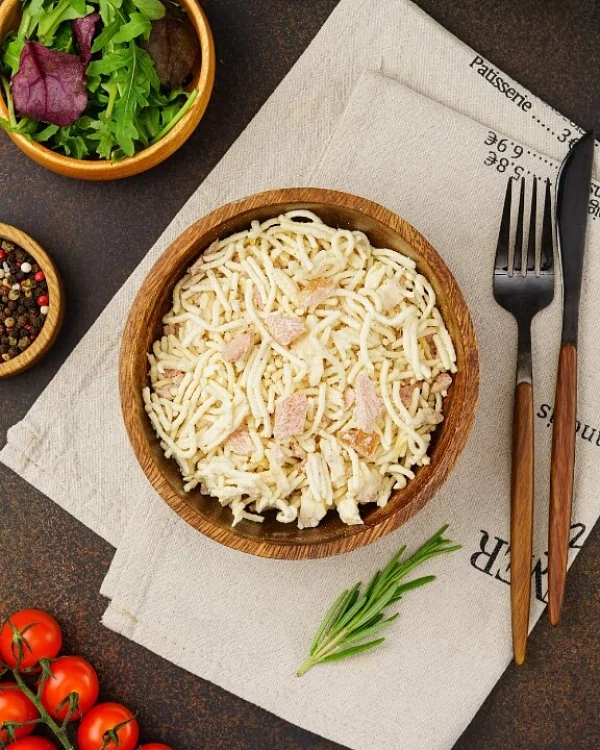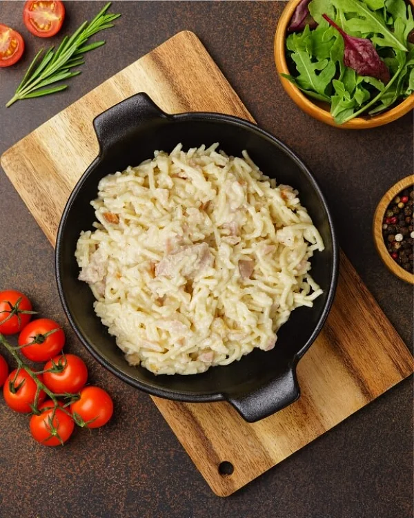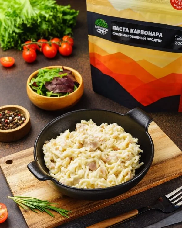 Макаронные изделия (мука из твердой пшеницы высшего сорта), карбонад к/в (свинина, соль поваренная пищевая, соль нитритная, экстракт кориандра, сывороточный продукт), сливки питьевые (22%), сыр гауда (пастеризованное молоко, соль, мезофильные и термофильные заквасочные микроорганизмы, молокосвертывающий ферментный препарат растительного происхождения), соль поваренная пищевая, перец чёрный молотый.